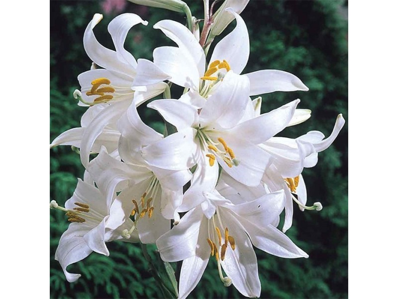 Цветки диаметром 20 см, белые, удлинённой формы, растущие вверх и в сторону. На белом фоне отогнутых лепестков выделяются бордовые тычинки.
