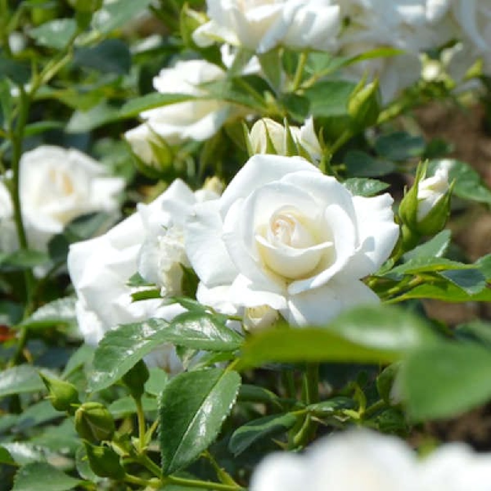 Цветки сияюще-белого цвета. Размер самого цветка 7-8 см. Они появляются в огромном количестве в кистях по 2-15 шт, так что весь куст покрыт цветами. Роза почти не пахнет. Куст хорошей формы, густой, иногда больше в ширину, чем в высоту(70-120 см), с мелкой листвой. Сорт очень устойчив к заболеваниям, не считая некоторой подверженности ржавчине в зараженной местности. Очень устойчив к дождю. Роза – отличная во всех отношениях. Цветет очень обильно и практически непрерывно до поздней осени, прекрасно зимует под легким укрытием.Зона морозостойкости (USDA) - пятая зона.