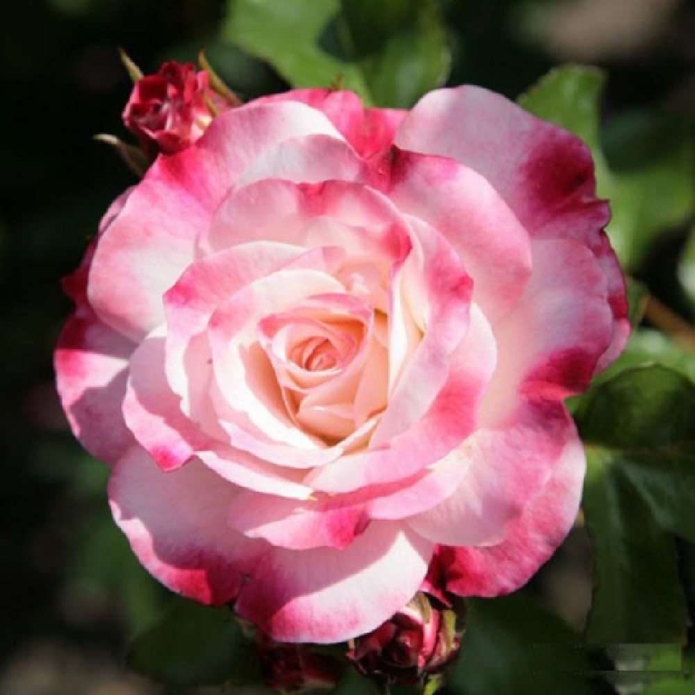 Цветки белые с красным краем, по мере распускания появляются красные штрихи и розовые потеки, махровые, почти не имеют запаха. Появляются в соцветиях по 2-3 цветка. Цветок 7-8 см в диаметре. Куст прямостоячий, ветвистый, до 1,2м. Листва темно-зеленая, густая, очень блестящая. Сорт очень устойчив к заболеваниям, хорошо переносит дождь, цветки не повреждаются. Цветение повторное. Сорт зимостоек.