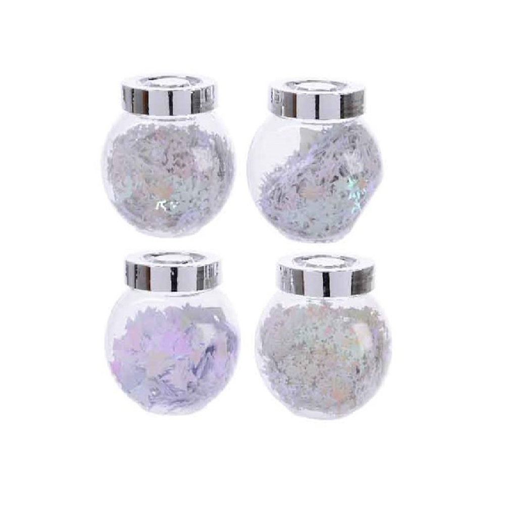 упаковка - баночка 30гр, содержимое баночки пластиковые фигурки белоснежные цвета, фигурки в ассортименте: ангел, дерево, снежинка, звезда, размер баночки 5.5x7.5x8см