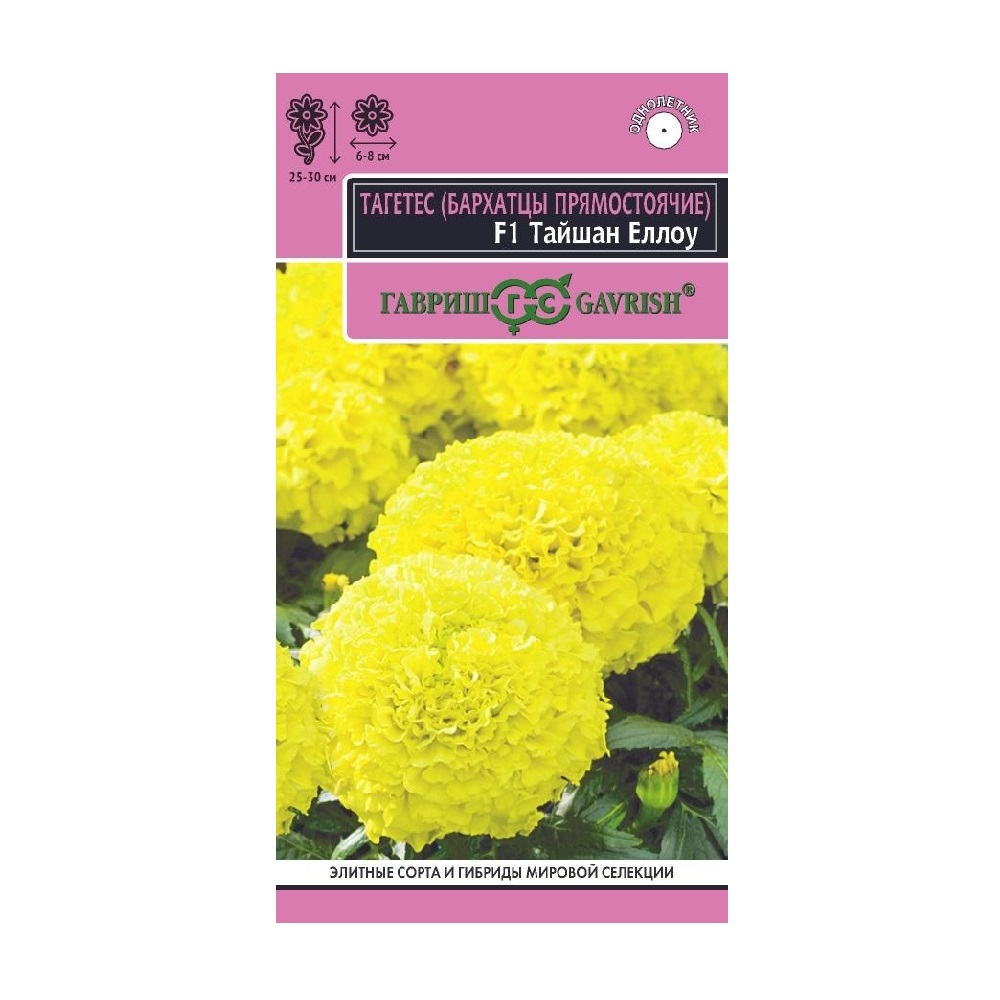 Лучший карликовый африканский тагетес в оформлении эффектных цветников, ландшафтного дизайна, для посадки в горшки и балконные ящики. Растения компактные с хорошим ветвлением высотой всего 25-30 см. Цветоносы на 20% короче, стебли на 15% толще обычных, что обеспечивает меньшее растяжение и ломкость Цветы крупные (6-8 см в диаметре) густомахровые ярко-желтого оттенка. Период цветения ранний, длительный до заморозков. Высокая устойчивость к неблагоприятным факторам. Растения светолюбивы и теплолюбивы, заморозков не переносят. Предпочитают легкие плодородные почвы. Посев на рассаду проводят во второй половине марта-начале апреля. Всходы появляются через 4-8 дней после посева, сеянцы пикируют в фазе 2-го настоящего листа. Рассаду высаживают в начале июня с расстоянием между растениями 20-25 см. Посев в открытый грунт проводят в мае на глубину 1,5-2 см.